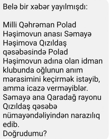 Paylaşdığım mesajı bir vətənpərvər vətəndaşımız mənə göndərmişdi. İşlərimizin çoxluğu səbəbiylə açıqlama verə bilməmişdim. Amma artıq bu kimi mesajlara cavab verməyin vaxtı gəlib. Mesajın cavabı:"doğru deyil."