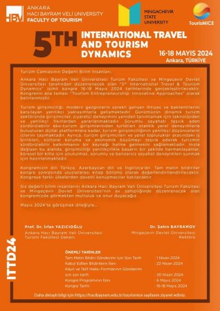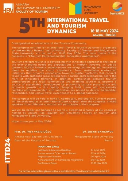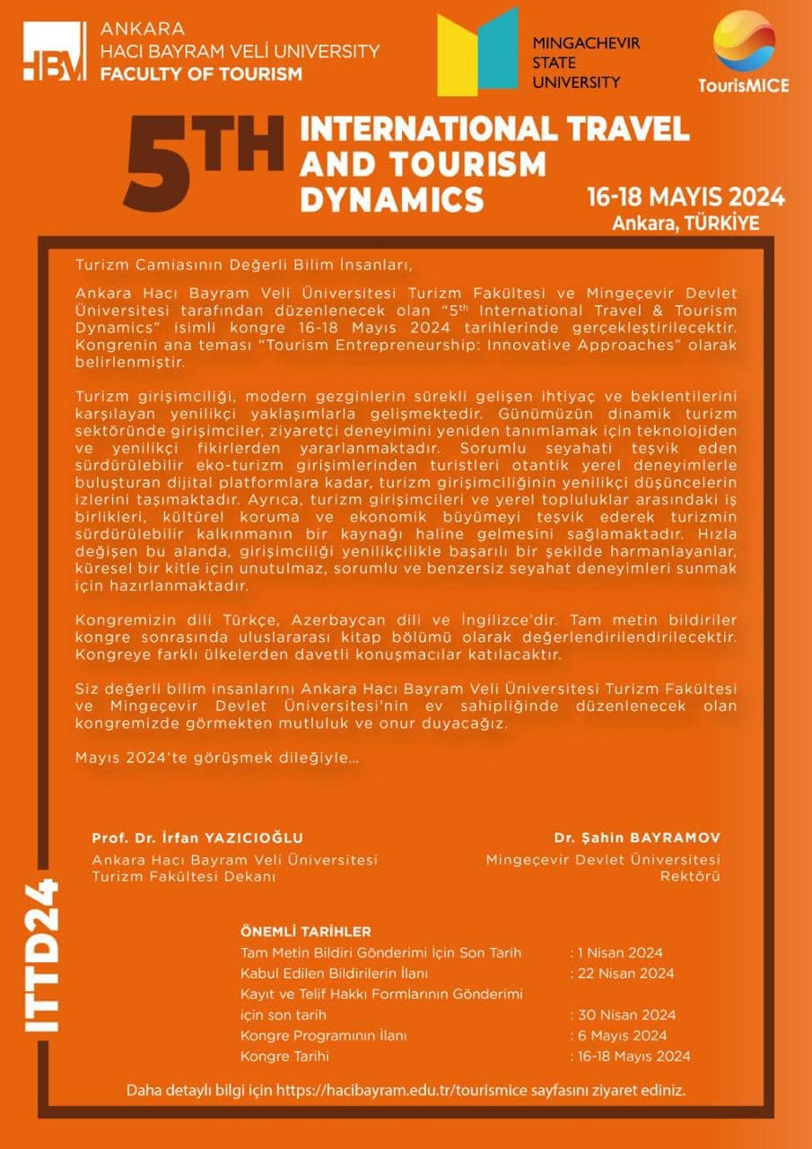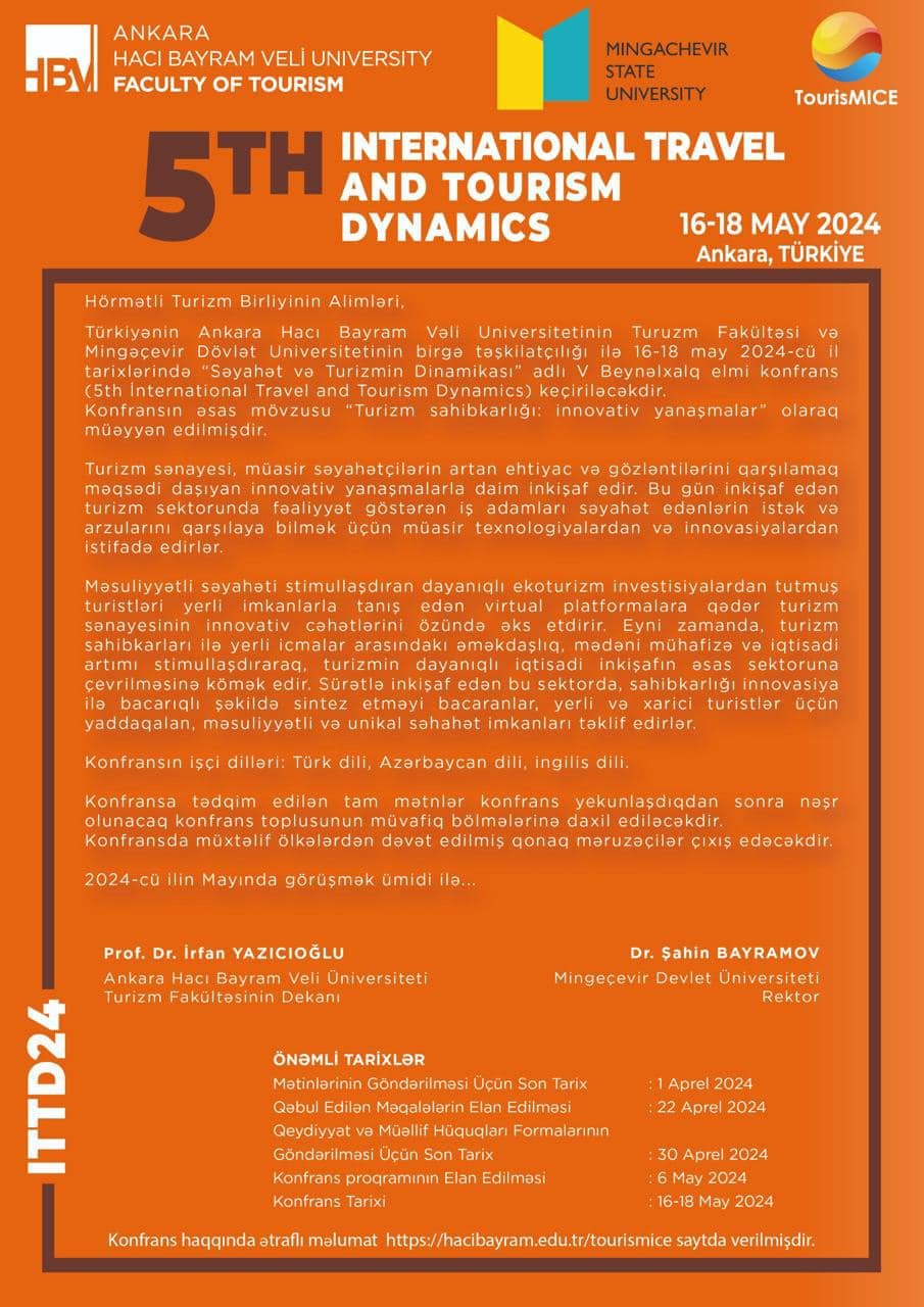 Türkiyə Respublikasında 16-18 may tarixlərində Ankara Hacı Bayram Veli Üniversitesi (AHBVÜ) və Mingəçevir Dövlət Universitetinin (MDU) birgə təşkilatçılığı ilə “Səyahət və turizmin dinamikası” (5th International Travel and Tourism Dynamics - ITTD 2024) mövzusunda 5-ci beynəlxalq elmi konfrans keçiriləcəkdir. Elmi konfransa ev sahibliyini Ankara Hacı Bayram Veli Üniversitesinin Turizm fakültəsi edəcəkdir.